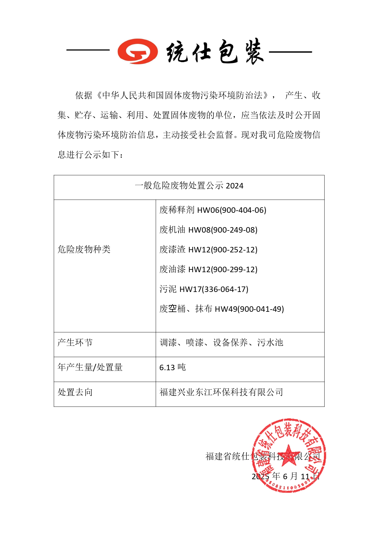 福建省統(tǒng)仕包裝科技有限公司危險廢物處置信息進行公示